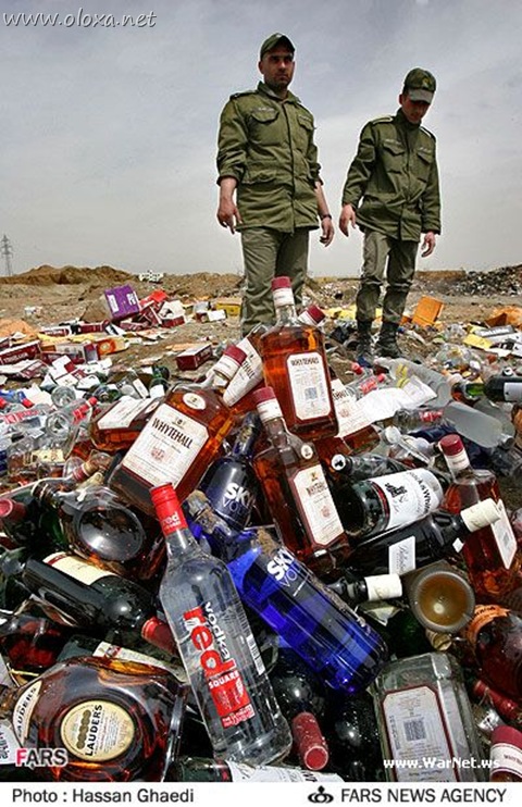 Aqui temos fotos da destruição de garrafas e latas de bebidas (Whisky, Vodka, vinho) feitas por soldados. As fotos são da Fars News Agency e foram tiradas por Hassan Ghaedi |